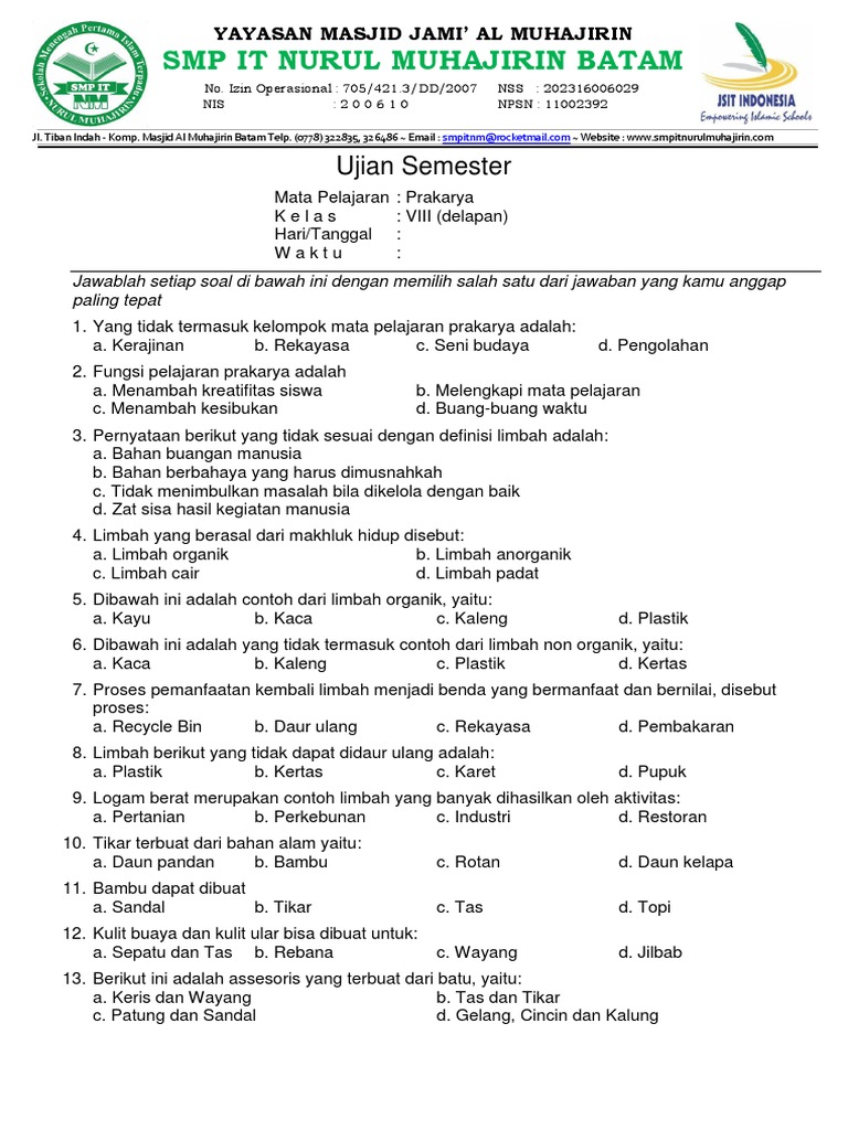 Materi pendidikan agama isalam kelas 7,,, adalah salah satu pelajaran yang mencakup dalam agama islam, yang sejak dulu di ajarkan oleh para nabi dan rosul. Bacalah setiap soal dengan teliti. Latihan soal ukk uas prakarya kelas 8 semester 2 kurikulum 2013 beserta kunci jawaban. Contoh soal uts mata pelajaran prakarya kelas vii smp/mts semester 2 (1). Mata pelajaran prakarya adalah mata pelajaran yang lebih sering melakukan praktek langsung daripada mempelajari materi pad. Buku pegangan siswa mata pelajaran prakarya semester 2 kurikulum 2013. Materi mata pelajaran prakarya kelas 8 (viii) semester 2 smp/mts berdasar buku kurikulum 2013 edisi revisi. Soal ukk pat prakarya kelas 8 kurikulum 2013 dan kunci jawabansahabat buku paket, dengan adanya latihan soal ukk/pat kelas 8 mata pelajaran prakarya ini. Soal uts ipa kelas 3 sd semester 2deskripsi lengkap. Soal pkn kelas viii semester ganjil 2019 2020 draft. Soal uts pts prakarya k13 semester 1 kelas 8 smp dan sumber : Soal ukk prakarya kelas 8 kurtilas. Periksa kembali pekerjaanmu sebelum diserahkan pada pengawas.